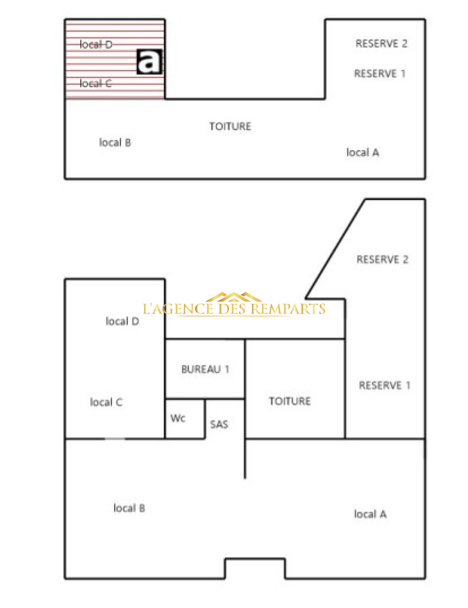 Surface commerciale 135 m2, Bureau de 11 m2, Cuisine de 12 m2, Reserve 20 m2, WC 1,5 m2, Cour 1 25 m2, Cour 2 29 m2, 2 garages de 20 m2