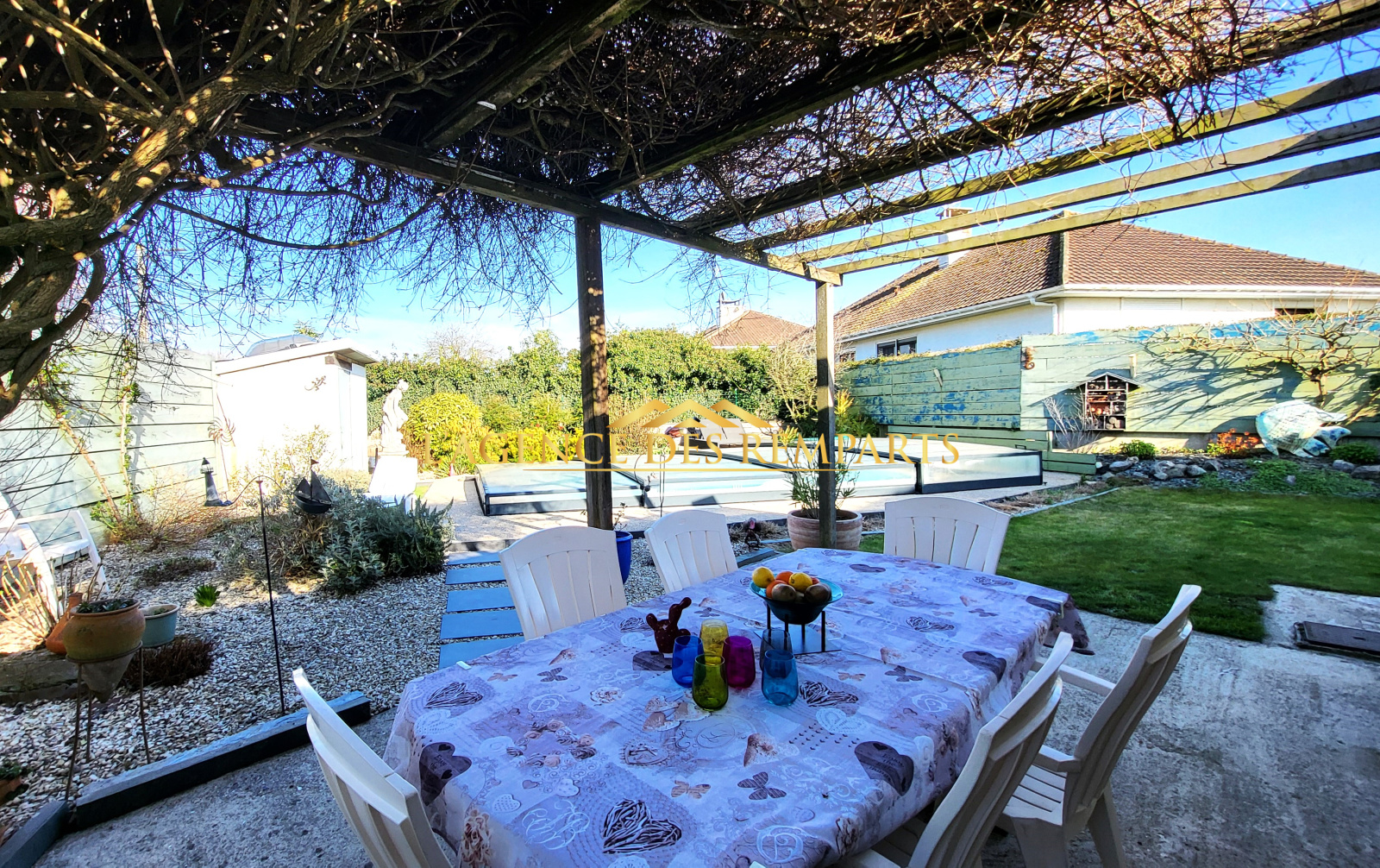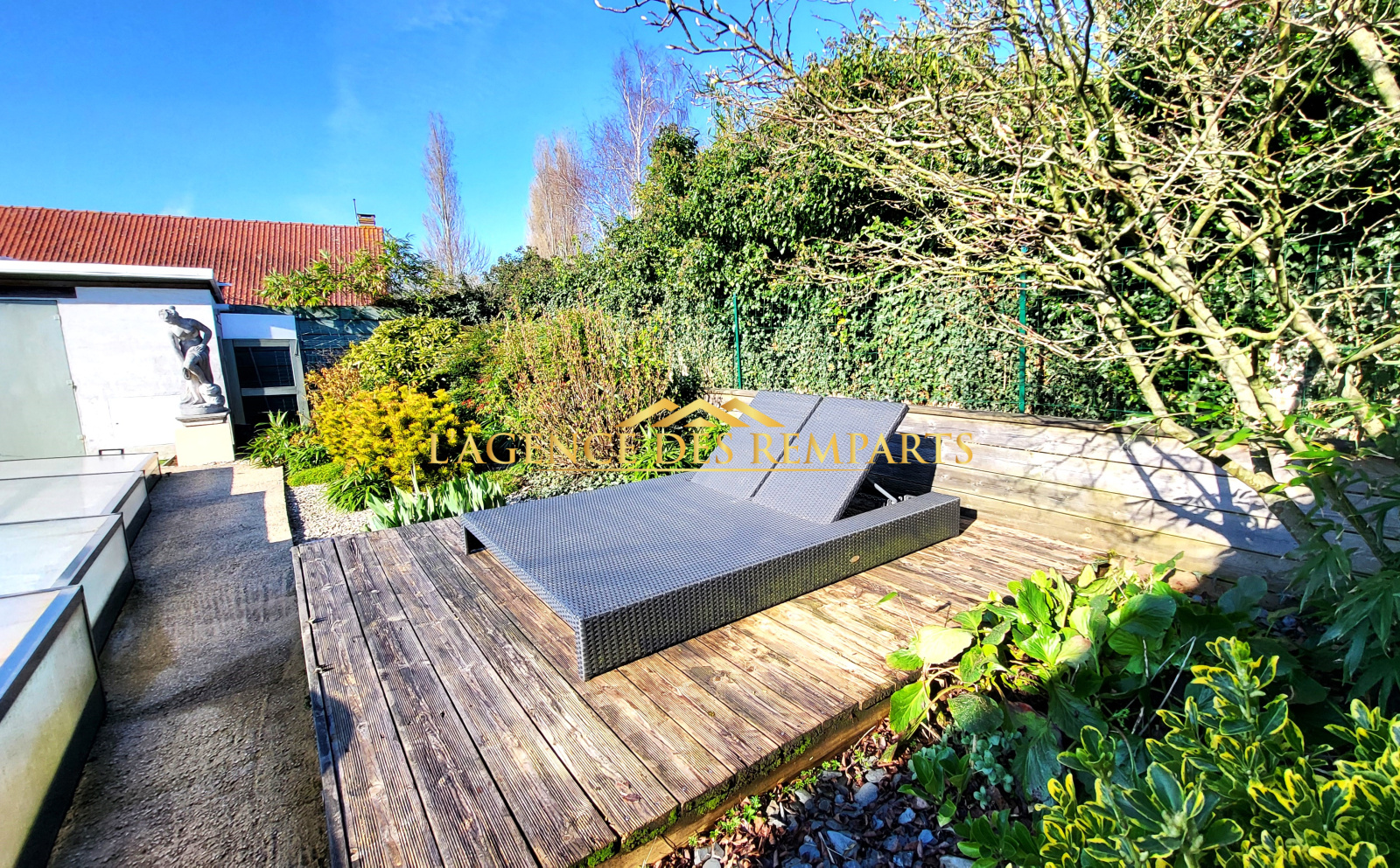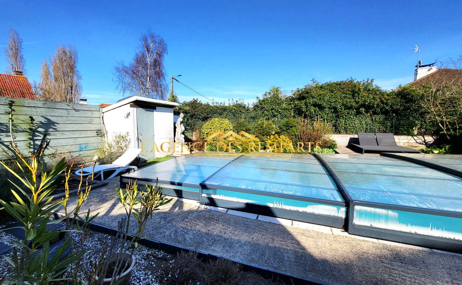 Jardin clos avec piscine de 28 m² (7x4) et 45 m3 (profondeur 1,60 m fond plat), équipée balnéothérapie et nage à contre-courant, revêtement gel-coat, filtration éco verre filtrant.