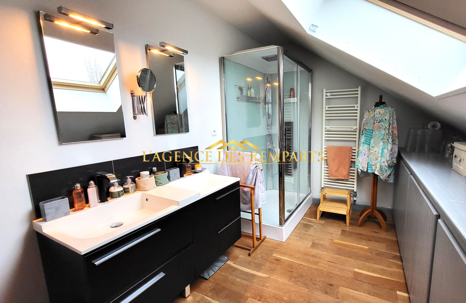 - grand palier (27 m²) avec nombreux placards aménagés sur mesure, distribuant 3 chambres dont une avec salle de douche privée,