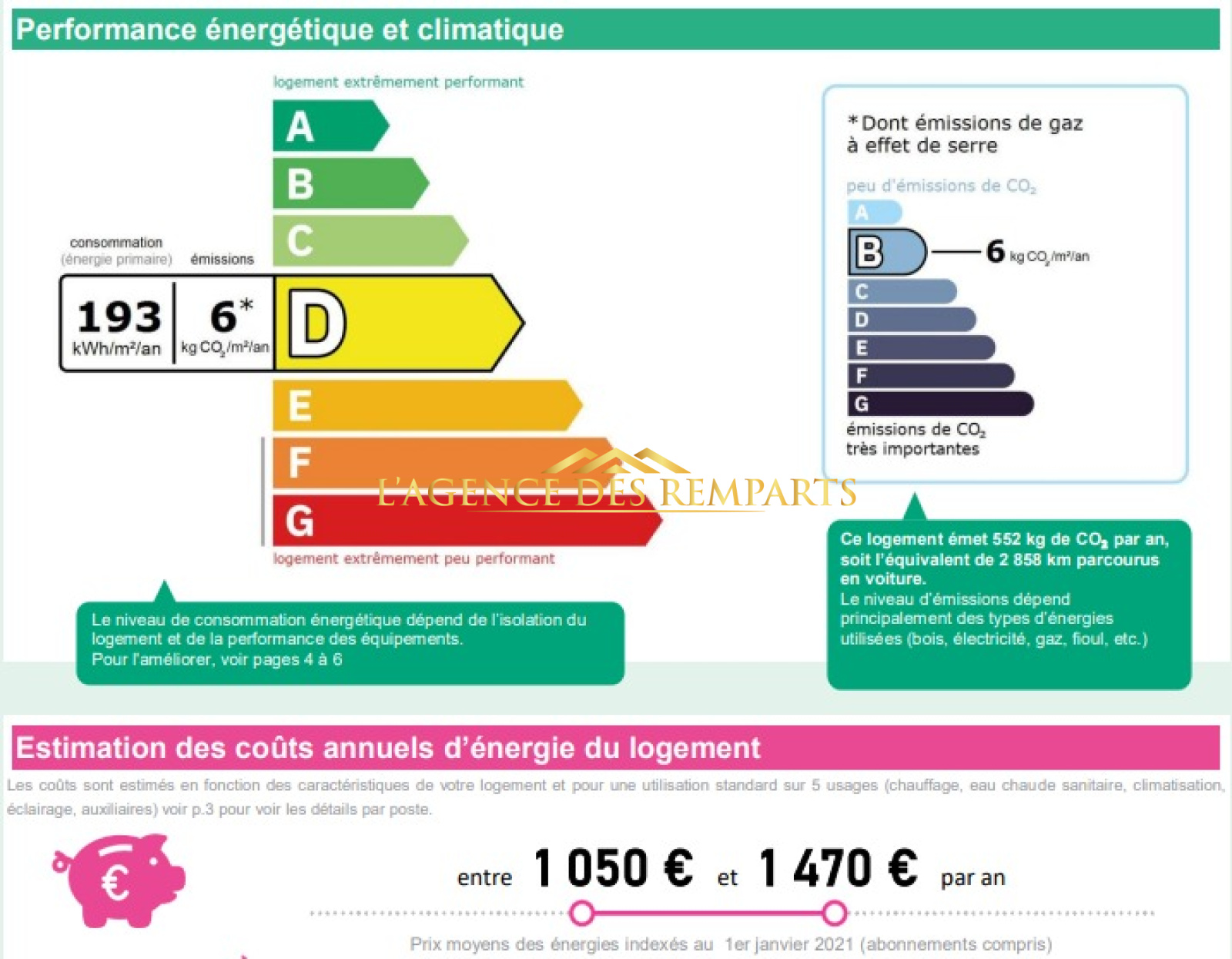 Montant estimé des dépenses annuelles d'énergie de ce logement pour un usage standard est compris entre 1 050 € et 1 470 € . 2021 étant l'année de référence des prix de l'énergie utilisés pour établir cette estimation.